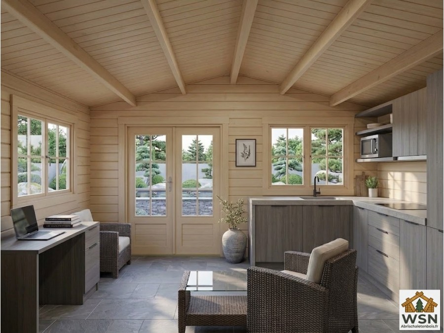 • Espace de Travail XXL : Aménagez un bureau professionnel de haut standing. Avec plus de 32 m², vous pouvez installer plusieurs postes de travail, une bibliothèque massive et un coin réunion, tout en profitant du calme absolu grâce aux parois de 44 mm à double languette.